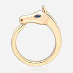 The Celebration Horse Head Ring is crafted in 18K gold and finished with two vivid blue sapphires, delicately set as the eyes of the sculpted horse motif. Elegant, modern, and refined, the design embodies strength, grace, and timeless sophistication.