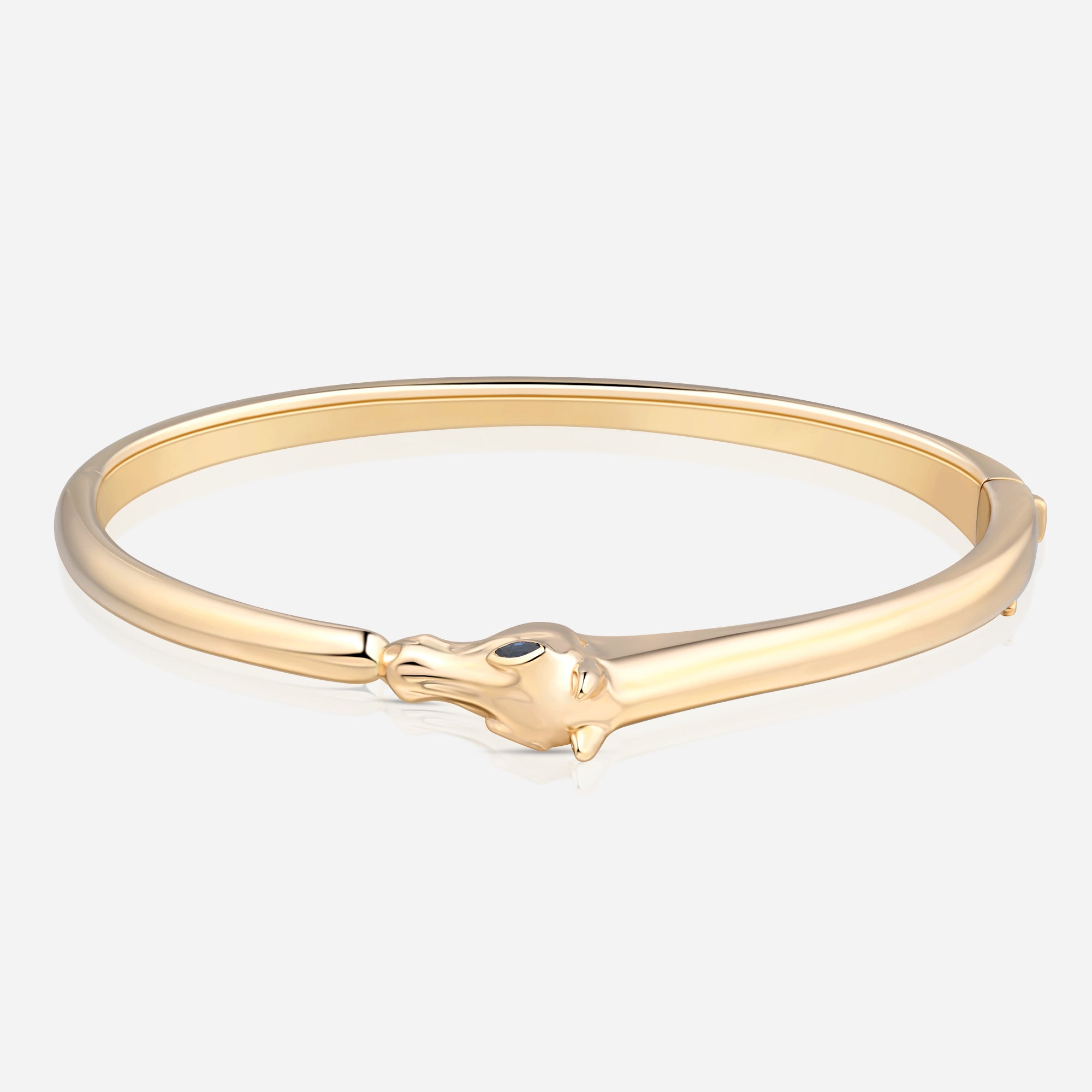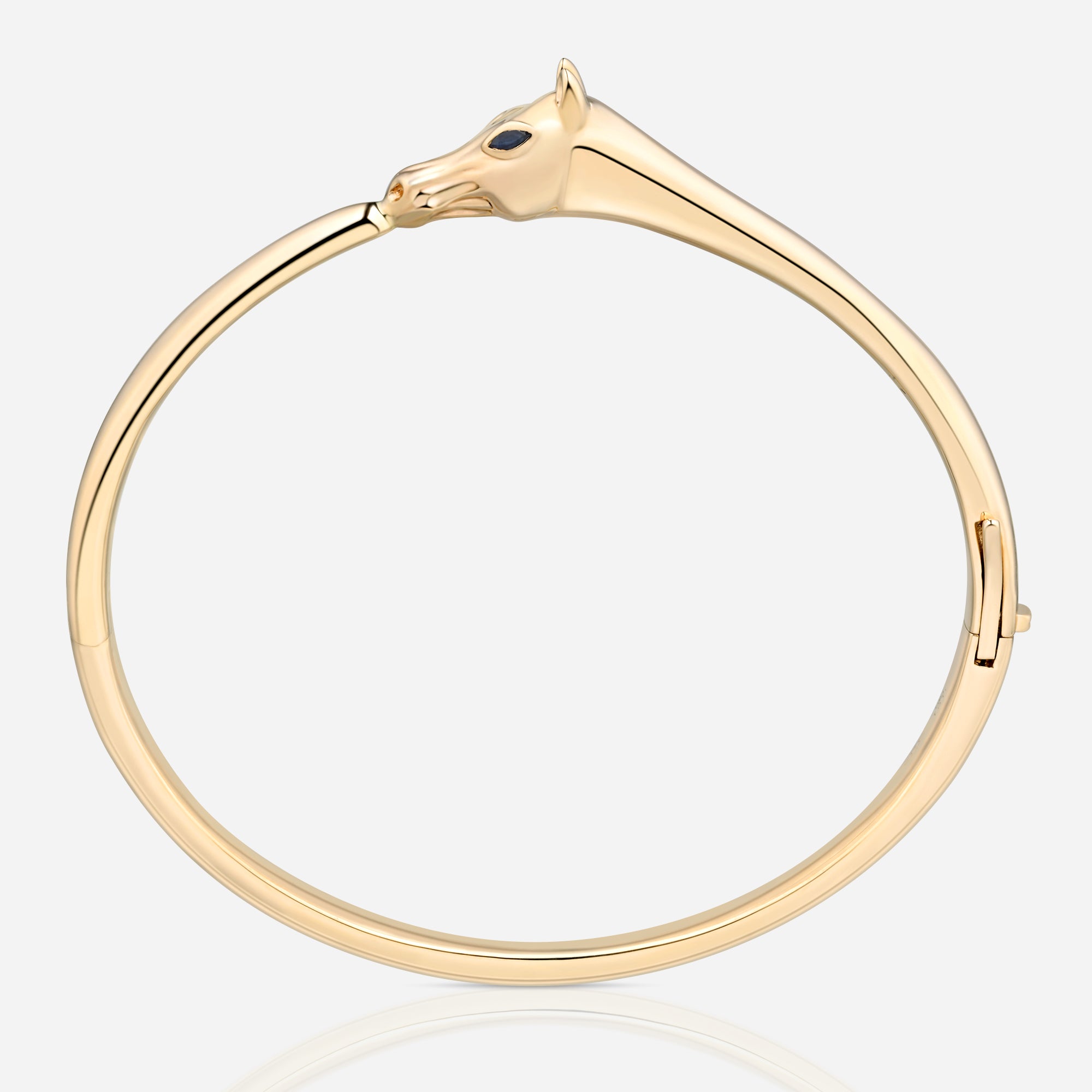 Two deep-blue sapphires illuminate the eyes of the horse motif, adding a precise touch of color and a subtle signature detail. Meticulously polished by hand, the bangle reflects light with a soft, mirror-like glow, highlighting the purity of its form.