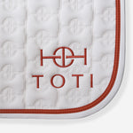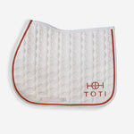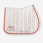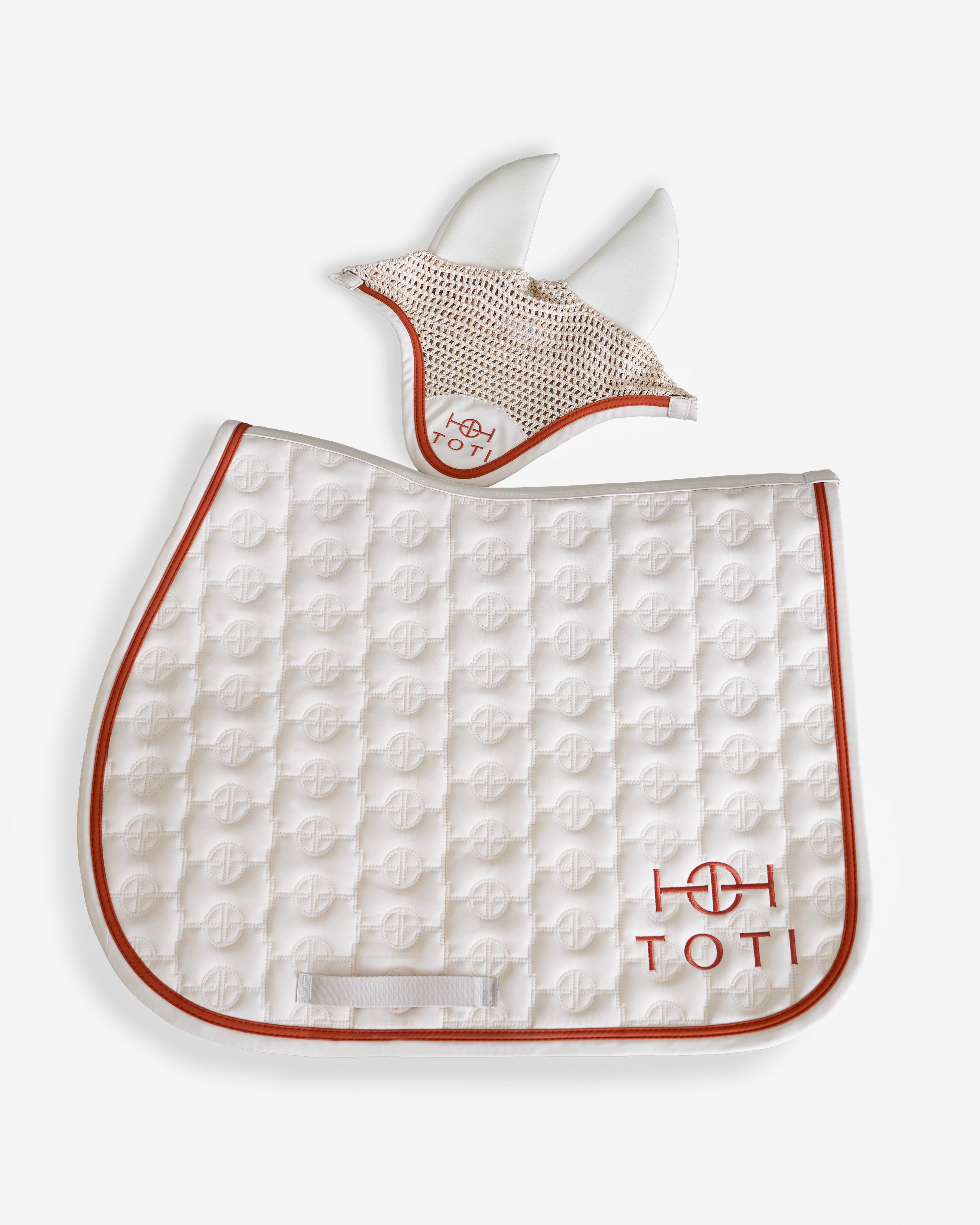 Our Beige Saddle Pad and Ear Bonnet set is designed for a refined, timeless presence in and out of the arena. The saddle pad features a sculpted anatomical fit with our signature embossed pattern, elevated by warm terracotta piping for a subtle contrast and polished finish.